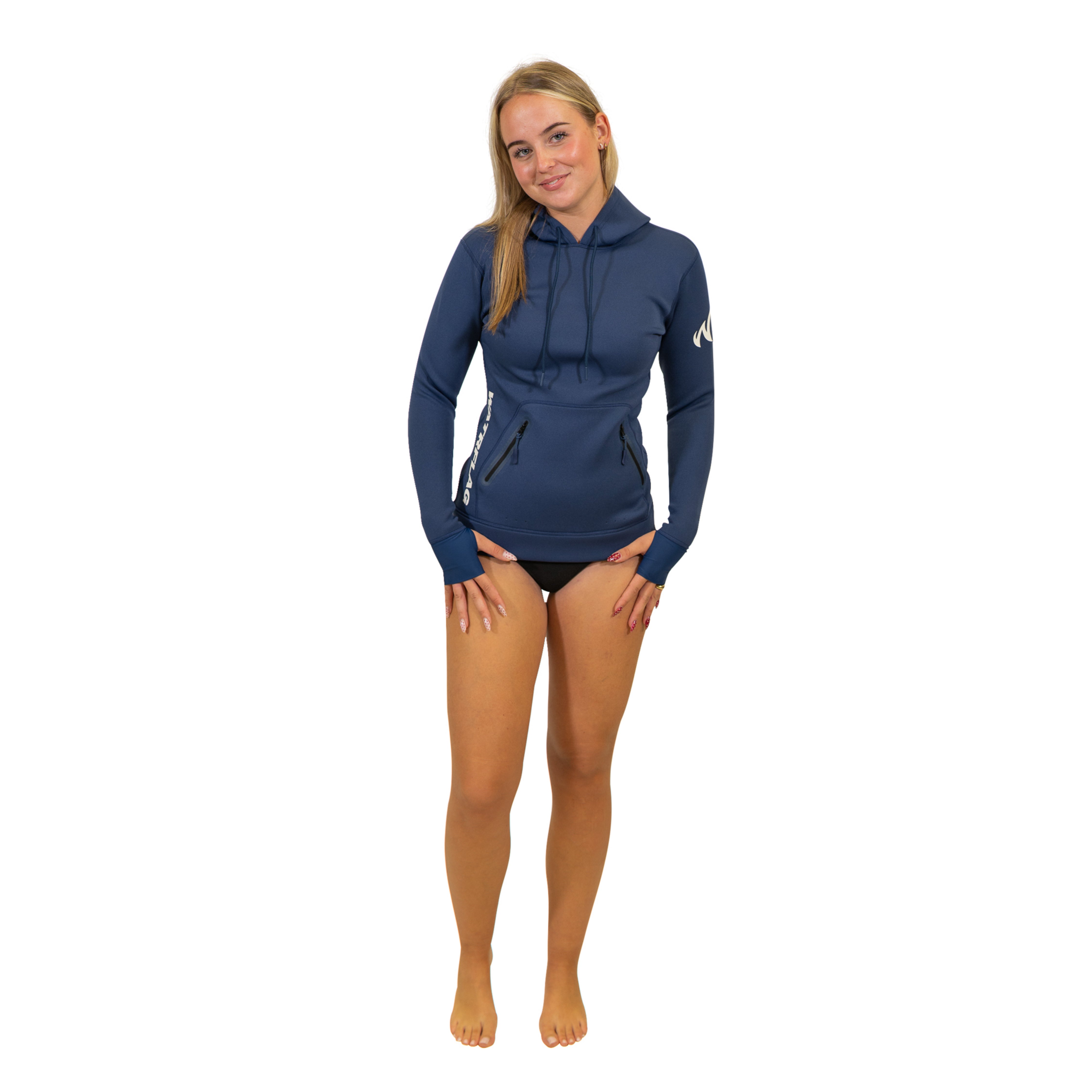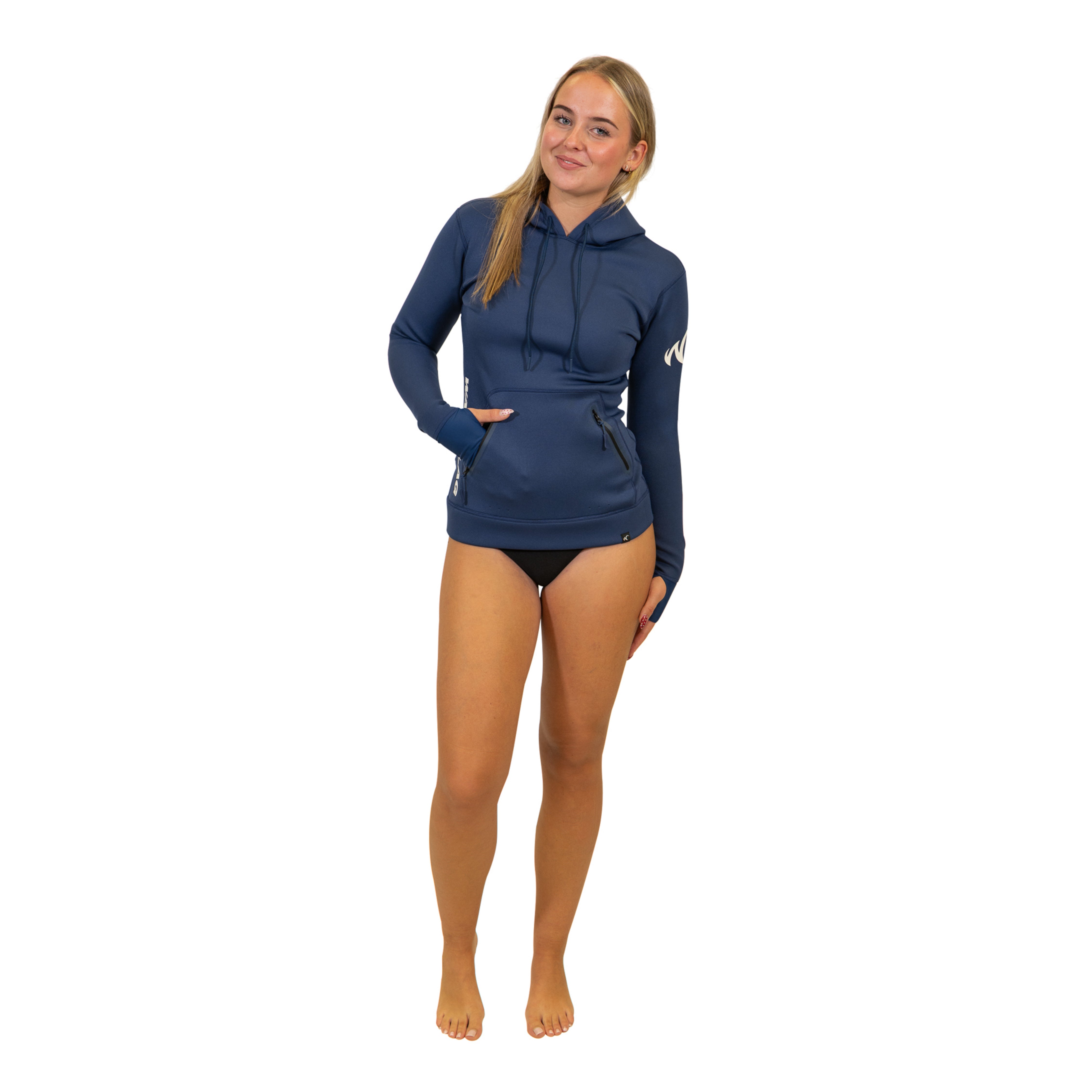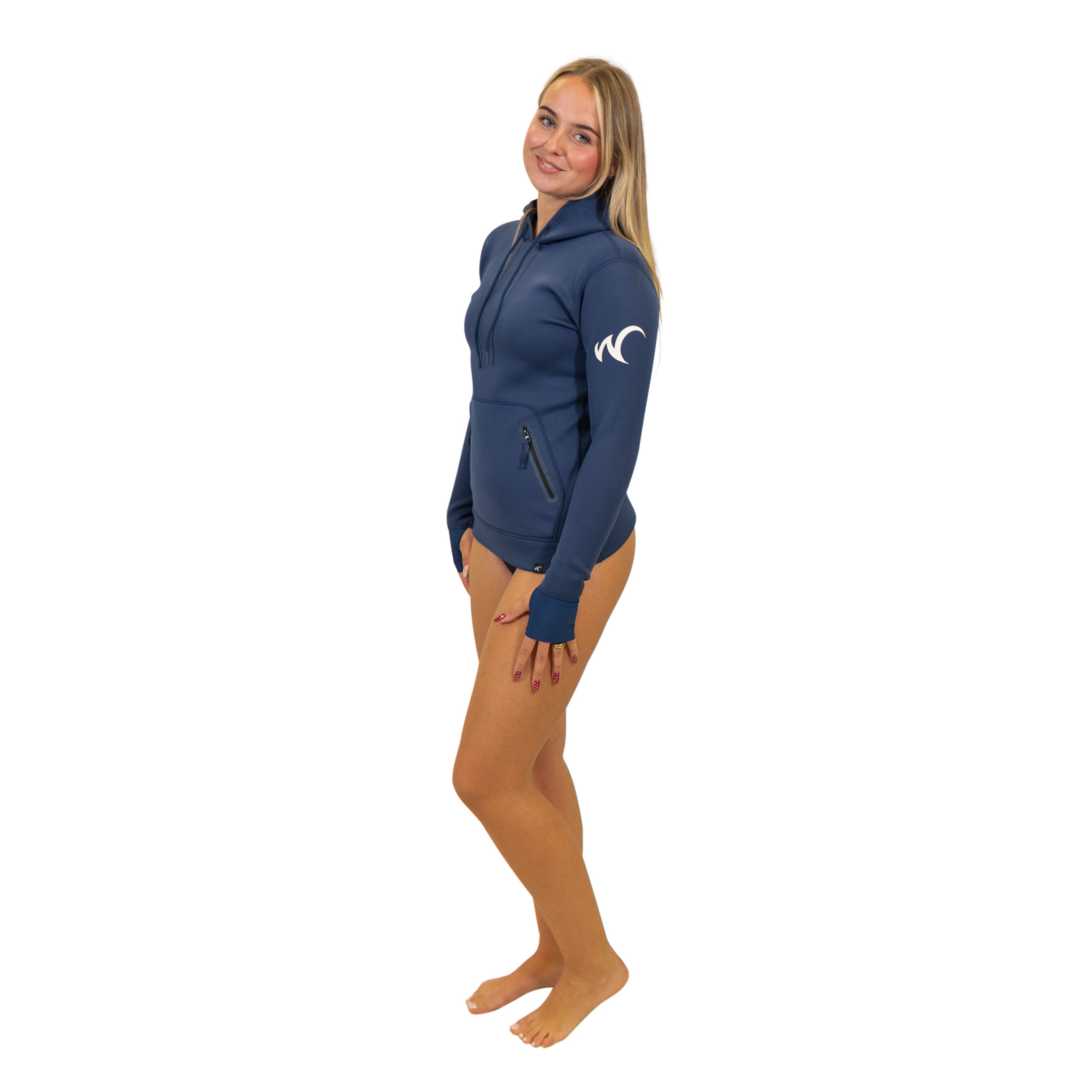 Hoodie van Neopreen (1,5 mm) voor dames met afsluitbare front zakken. Handig om je sleutels en telefoon veilig in op te bergen. Ideaal voor op en om het water zoals surfen en suppen. Mouwen met duimlussen voor gestroomlijnde pasvorm. Eventueel water in de zakken wordt via de kleine gaatjes onderin afgevoerd. De Neopreen Hoodie kan rechtstreeks op de huid worden gedragen. Daar is de maatvoering ook op gebaseerd. Mocht je er wat onder willen dragen is dat mogelijk, maar neem dan een maat groter!